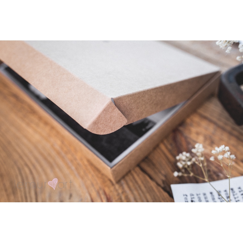 Pudełko MIŁOŚĆ w kolorze KRAFT, w rozmiarze 15x23 cm, wysokość pudełka 2,5cm na maksymalnie 100szt zdjęć. Pudełko pomieści zdjęcia w rozmiarach 15x21 cm lub 15x23 cm. Pudełko jednoczęściowe wykonane z gładkiego, cienkiego kartonu. Pudełko wyróżnia delikatny nadruk umieszczony na froncie w kolorze czarnym.