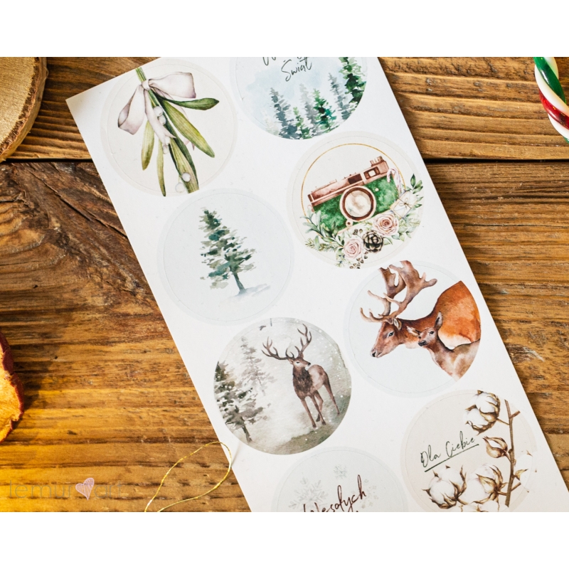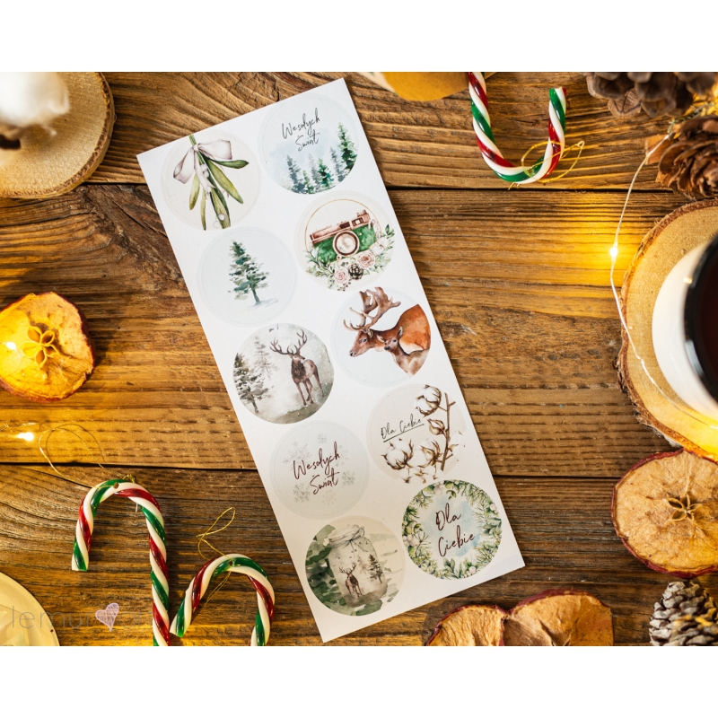 Zestaw Świątecznych naklejek w leśnym klimacie.